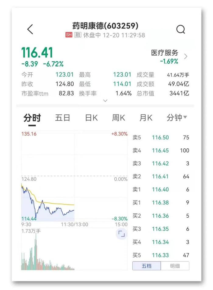 今日上午,CRO板块连续下跌,药明康德一度跌近9%,泰格医药、康龙化成、药石科技跟随走低。截至收盘,药明康德报收116.41元/股,下跌6.72%。