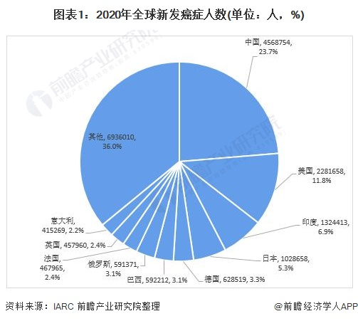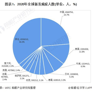 根据世界卫生组织国际癌症研究机构(IARC)数据,2020年,全球新发癌症病例1929万例。其中,中国新发癌症病例457万例,由于中国人口基数较大,癌症新发人数远超世界其他国家,占全球新发癌症的比例为23.7%。