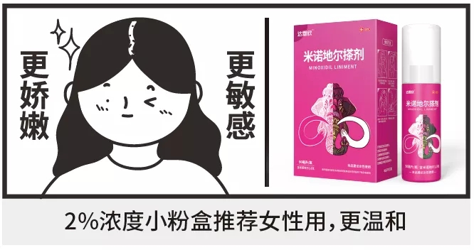 米诺地尔是唯一经美国FDA和中国NMPA批准的外用生发药。在面向脱发患者时,大多为5%浓度的米诺地尔产品,但是临床上发现,女性在使用5%浓度的米诺地尔时,局部或广泛多毛症发病几率会提升。为解决这一问题,达霏欣率先提出男女分治的理念,研发5%和2%两种浓度的达霏欣米诺地尔搽剂,分别用于男性和女性的脱发治疗,同时更加符合男女皮肤特性。历经二十余年的发展,达霏欣如今在临床市场上已经获得专家的认可以及患者的口碑认同。