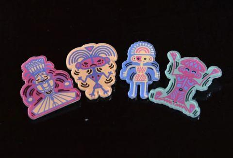 四款白色的布袋,分别印着喜怒哀乐四种颜色的“彝族表情”,郑瑶称,“戏剧代表人生,人生就是喜怒哀乐”,因此,这些从经书上提炼出来的元素又以喜怒哀乐的四种形态,出现在布袋、胸牌以及泡泡贴等物件上,从形态到配色,都兼具国潮与国际范儿。虽然大凉山文创的开发始于2017年底,从和彝文专家、毕摩专家一起收集材料元素,到2018年推出阿惹妞系列、朵洛荷系列、火娃系列和彝文系列,今年戏剧节系列全新上线,便吸引了很多嘉宾和演出团队的关注,老虎系列似乎人气最旺。戏剧节文创,品种涉猎不多,但每一样都传递着讲不完说不尽的彝族文化。