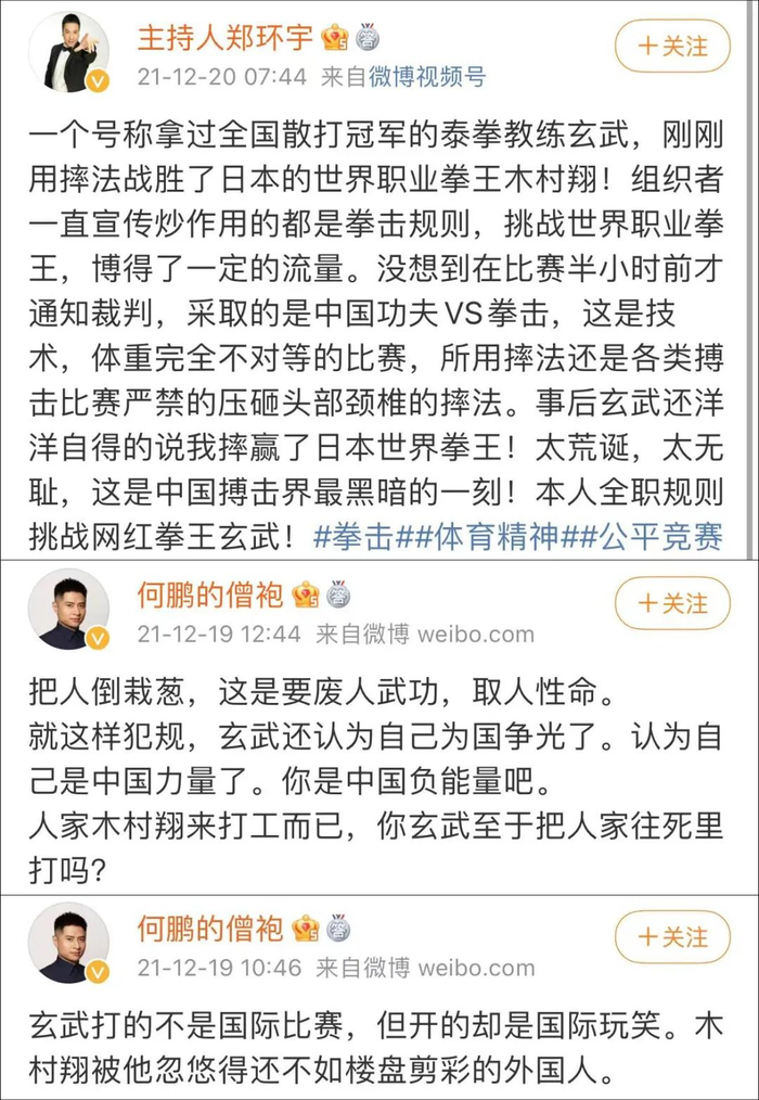 知名解说评论员群情激愤,英雄雄传说职业搏击大赛@主持人郑环宇 大呼“这是中国搏击界最黑暗的一刻!”;被誉为“中国最专业的MMA解说”的@何鹏的僧袍 则无奈调侃“玄武打的不是国际比赛,但开的却是国际玩笑。木村翔被他忽悠得还不如楼盘剪彩的外国人。”