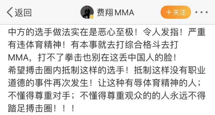 中国MMA综合格斗名将@费翔MMA 指玄武方的做法“令人发指”,严重有违体育精神,呼吁圈内抵制这样的选手,让这种有辱体育精神的人、不懂得尊重对手、不懂得尊重观众的的人永远不得踏足搏击圈。