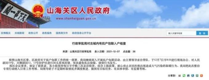 根据山海关区政府官网12月7日发布的消息称,区行政审批局主要领导亲自带队,现场办公,对人民胡同10号、兴顺胡同12、13号封炉灶进行“回头看”再封堵,坚决避免私自烧煤、烧柴行为发生。