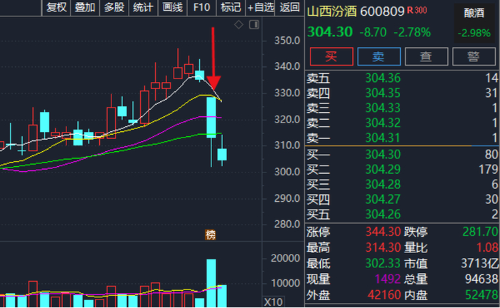 受上述消息影响,12月16日当天,山西汾酒股价大跌,盘中一度逼近跌停,最终收跌6.57%,全天成交额放大至60.9亿元。12月17日,山西汾酒又跌了近3%,最新股价为304.3元,市值为3713亿元。