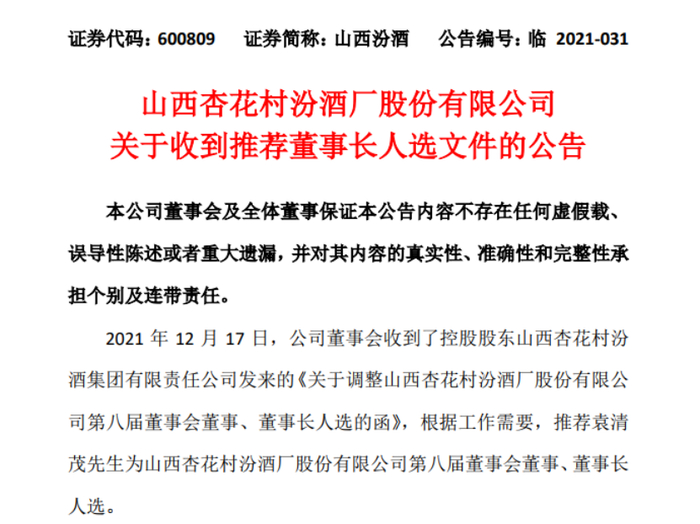 李秋喜辞职后,接任者会是谁呢?12月19日晚间,山西汾酒发布公告称,12月17日,公司董事会收到了控股股东汾酒集团发来的《关于调整山西杏花村汾酒厂股份有限公司第八届董事会董事、董事长人选的函》,根据工作需要,推荐袁清茂为上市公司第八届董事会董事、董事长人选。