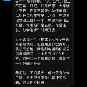 据该员工透露,拿到每月1700元底薪的前提是完成总共167个小时的法定工时。不过,通常员工们每月工作时长会达到300小时左右,每天工作10小时。此外,隔三差五晚上11点,在正常早班晚上8点下班后,还要回到门店开会。