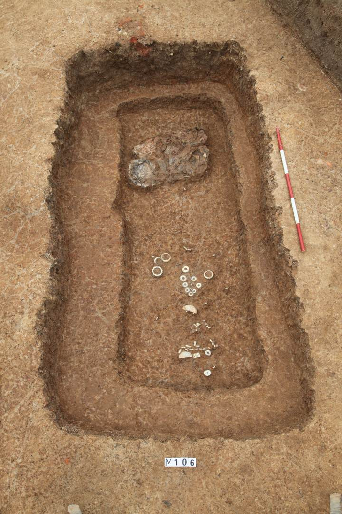 2021年6月,在对北村南地点进行发掘时,发现了一批高等级墓葬,其中M106出土了龙首镯、镂孔兽面纹冠状器、璜串、玉蝉等重要玉器。这些高等级墓葬均分布在发掘区北部的台地上,头向朝南。