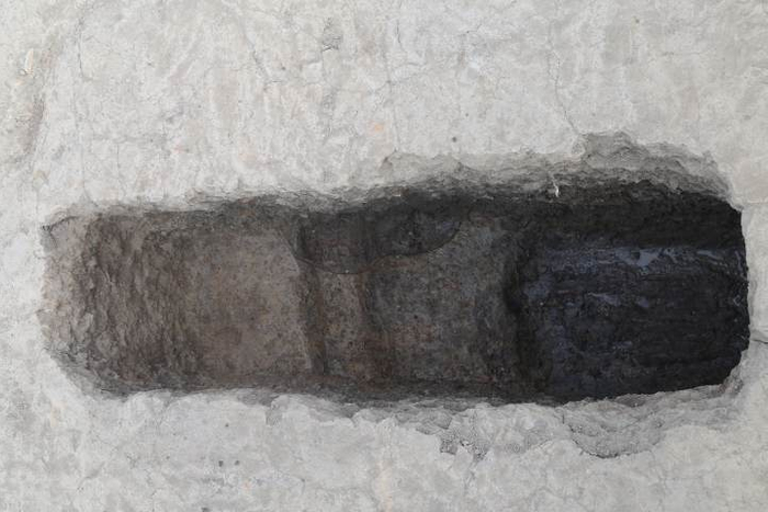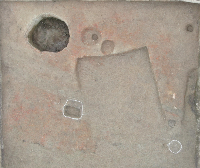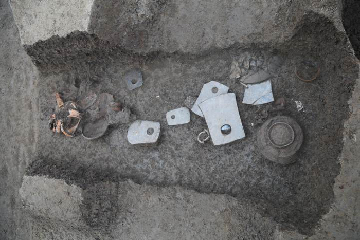 在台地南坡底部,发现有一条长灰沟,灰沟北部则分布着一排约30个较大的方形柱坑。以灰沟为界,北部台地与南部地势较低处的墓葬呈现出明显的等级分化。推测灰沟及其北部的柱坑可能为一处大型栅栏或围墙遗迹,起到将台地上的贵族和台地下的平民隔离的作用。