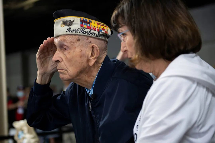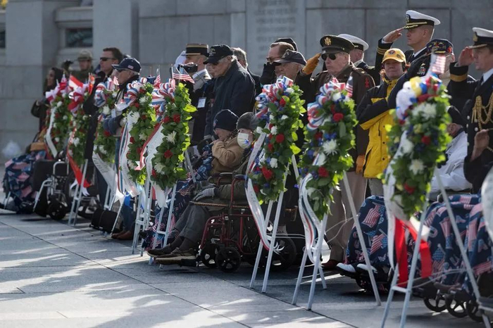 ▲ 2021年12月7日,在纪念日本偷袭珍珠港事件80周年纪念仪式上,美国二战老兵献花圈。