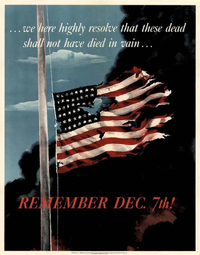 ▲ 1942年,美国战时情报局发布美国画家艾伦·萨尔堡的纪念日本偷袭珍珠港事件海报,名为《记住12月7日!》。