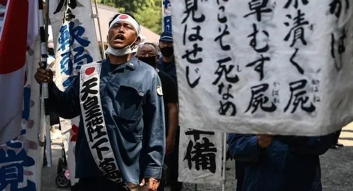 ▲ 2020年8月,日本极右翼团体成员在靖国神社入口游行。