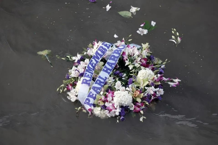 ▲ 日本偷袭珍珠港事件烈士家属扔下的花圈漂浮在美国哈德逊河上。