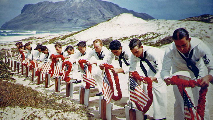 ▲ 1942年12月7日,夏威夷卡内奥赫湾海军航空站的士兵将花环放在他们在日本偷袭珍珠港时丧生的战友的坟墓上。