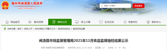 中国质量新闻网讯 近日,福州市闽清县市场监督管理局发布2021年11月食品监督抽检结果公示。