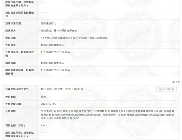 中国网财经12月20日讯 据信用中国网站消息,12月15日,北京朝阳区消防救援支队向北京宜家家居有限公司(简称“北京宜家家居”)下发两份行政处罚决定书。处罚原因为消防设施器材未保持完好有效、未开展消防安全教育和消防知识培训、定期进行灭火技术训练,两份决定书合计罚款3.45元。