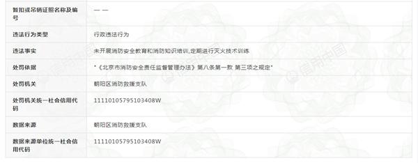 朝(五)(消)行罚决字﹝2021﹞0794号决定书显示,在上述消防监督抽查时还发现,该单位未开展消防安全培训,无培训记录、无演练照片。存在“未开展消防安全教育和消防知识培训,定期进行灭火技术训练”的消防违法行为。依据《北京市消防安全责任监督管理办法》第八条第一款第三项之规定对其处罚款1.6万元。