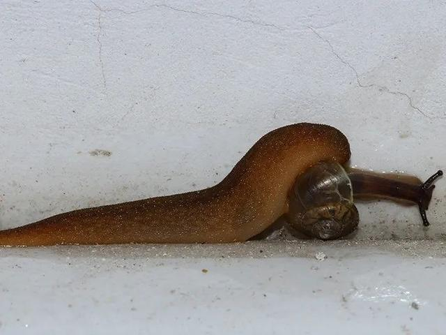 (一条狮纳蛞蝓正在猎食一只可怜的灰尖巴蜗牛)