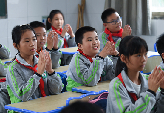 10月27日,东林镇第二小学的学生在心理健康课上参加互动游戏。当日,浙江省湖州市东林镇第二小学开展护航青少年心理健康系列行动,心理咨询师通过课件讲解、一对一心理辅导、趣味小游戏等形式让同学们了解心理健康的重要性,学习心理健康知识。 新华社记者 徐昱/摄