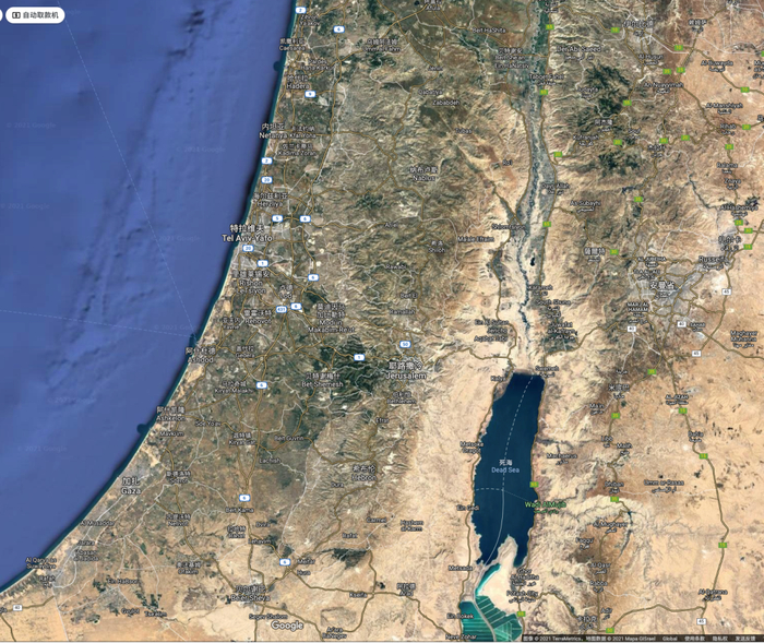 在谷歌地图和谷歌地球(Google Earth)上搜索“Palestine”,自动定位到如图所示区域。