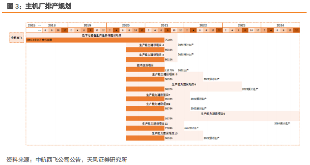 中航沈飞新机研制生产能力建设项目于2018年启动已经进入产能爬坡阶段,洪都航空南北区厂房建设项目预计2022年可全部投入生产使用,中直股份研制保障建设、航空零部件产业园等项目预计于2021-2022年陆续投入生产。中航西飞累计投入5.3亿元建设的数字化装备生产线条线建设项目,预计于2021年10月31日投入使用,同时2021年中报披露,有10项生产能力建设项目预计于2021-2023年间完工达产。