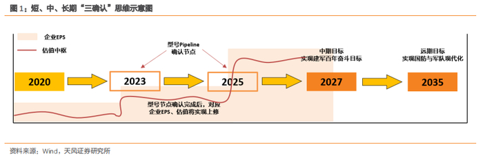 两大重要中间节点:在2027年作为中期节点的时间窗口下,我们判断型号Pipeline重大节点(研制转批产)有望出现在中间节点2023年及“十四五”末2025年。