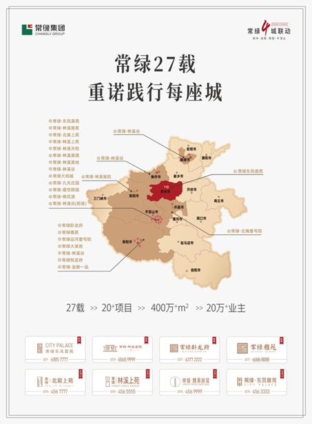历经27载,河南常绿集团总结出一套成熟的开发经验,多年来,在产品规划、成本管控、施工管理等方面均形成了一系列管理标准。另外,常绿集团已经形成了以房地产开发为龙头,物业售后为重要保障的产业发展格局,立志成为中国三、四线城市最优秀的地产投资运营商之一。