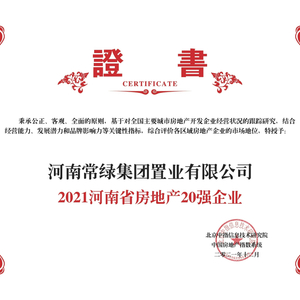 河南常绿集团置业有限公司(以下简称“常绿集团”)凭借良好的市场表现被评为“2021河南省房地产20强企业”。