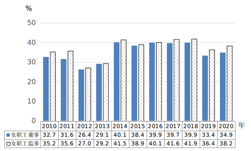 图62010—2020年企业职工董事和职工监事中女性所占比重