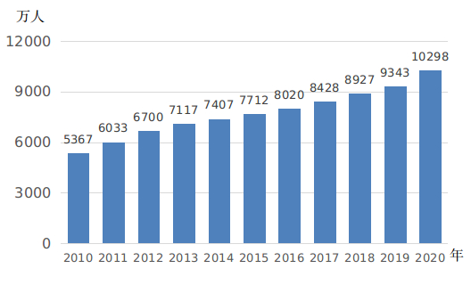 2.女性参加医疗保险的人数大幅增加。近年来,我国在城乡妇女基本医疗保障实现制度全覆盖的基础上,通过整合城乡居民医疗保险,完善城乡医疗救助和补充医疗保险制度,进一步完善多层次医疗保障体系,使更多女性享有更公平的医疗保障。2020年末,全国女性参加基本医疗保险的人数为6.5亿人,是2011年末[10]的3.4倍;其中,参加职工基本医疗保险的人数为1.6亿人,比2010年末增加5801.8万人,增长55.1%;参加城乡居民基本医疗保险的人数为4.9亿人,比2011年末增加4.1亿人,是2011年末的6.5倍。