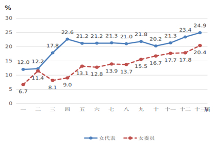 1.全国女人大代表和女政协委员占比均达历史最高。《纲要》实施以来,我国积极推动和支持妇女参政议政,妇女参与决策和管理的比例明显提高,妇女的政治权利得到有力保障和加强。2018年召开的第十三届全国人民代表大会共有女代表742名,占代表总数的24.9%,比第十一届(2008年)提高3.6个百分点,是历届人大代表中女性比重最高的一届(见图5)。政协第十三届(2018年)全国委员会中有女委员440人,占委员总数的20.4%,比第十一届(2008年)提高2.7个百分点,也是历届政协委员中女性比重最高的一届(见图5)。