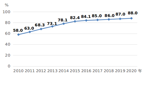 3.农村人居环境持续改善。2018年,中央农办等18个部门联合印发《农村人居环境整治村庄清洁行动方案》,启动并实施村庄清洁行动,目前农村人居环境整治三年行动方案目标任务全面完成。全国95%以上的村庄开展了清洁行动,村民的环境与健康意识进一步增强,村庄环境趋于干净整洁。2020年,农村集中式供水受益人口比重达到88.0%,比2010年提高30个百分点,实现《纲要》“达到85%左右”的目标(见图8)。