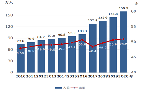 4.各类高等教育中女生占比均超过男生。《纲要》实施以来,我国高等教育得到快速发展,女性接受高等教育机会不断增加;多渠道、多形式为贫困和残疾女大学生提供资助,女性平等接受高等教育得到有力保障。2020年,高等教育毛入学率为54.4%,比2010年提高27.9个百分点。高等教育在校生中女研究生人数为159.9万人,占全部研究生的比重达到50.9%,比2010年提高3.1个百分点(见图4);普通本专科、成人本专科在校生中女生分别为1674.2万人和450.6万人,占比分别为51.0%和58.0%,分别比2010年提高0.1个和4.9个百分点。