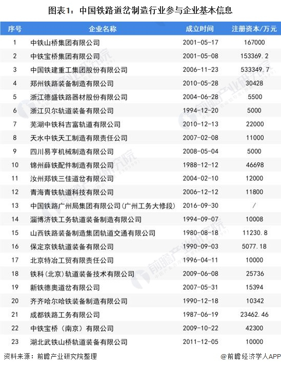 铁路道岔是使铁路机车车辆从一股道转入另一股道的线路连接设备,是保障铁路稳定、安全运行的基础设备。由于铁路道岔的产品质量对铁路安全至关重要,我国铁路道岔制造行业实行审批备案制。获得中铁检验认证中心有限公司认证证书(CRCC)是生产企业的产品应用到国家铁路领域及其他有该认证要求的项目的前提条件。根据国家铁路局于2020年10月在其官网发布的《铁路运输基础设备生产企业审批名录》,获得铁路道岔设备生产资质的企业共有23家,具体名单如下: