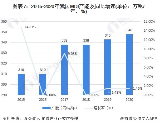 MDI、TDI为聚氨酯的重要原材料,其产能与聚氨酯的产量紧密关联。根据隆众统计数据显示,2015年国内MDI增幅14.81%,主因重庆BASF40万吨/年装置扩产并试车成功,2017年,联合二期24万吨/年母液装置投产。2020年,我国MDI产能为348万吨/年,产能主要集中在万华化学。