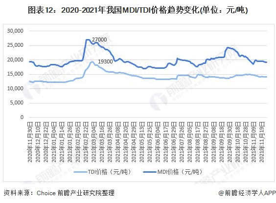 聚氨酯的价格走势与两大主要原材料息息相关。2021年2-3月,由于下游市场需求的释放,使得上游原材料供应紧张,价格迎来大幅上涨,MDI价格达到27000元/吨,TDI价格达到19300元/吨。