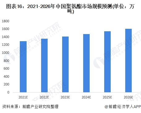 2021-2026年,随着国家节能环保口号的提出以及大力实施,我国的聚氨酯消费量将继续上升,但是受疫情以及相关房地产调控政策的影响,我国聚氨酯消费量增速较为缓慢。前瞻产业研究院预计,2026年,我国聚氨酯的消费量将突破1600万吨。