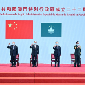 南方财经全媒体记者田静 澳门报道  12月20日,是澳门回归祖国22周年纪念日。澳门特区行政长官贺一诚与一众特区政府官员,20日上午8点和国家奥运精英运动员代表团一起在金莲花广场举行升旗仪式。