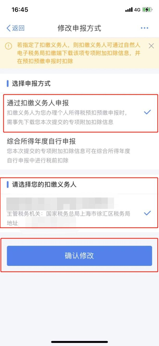 在【修改申报方式】页面中,点击【选择申报方式】下的【通过扣缴义务人申报】,在【请选择您的扣缴义务人】中选择您当前的任职受雇单位,点击【确认修改】。