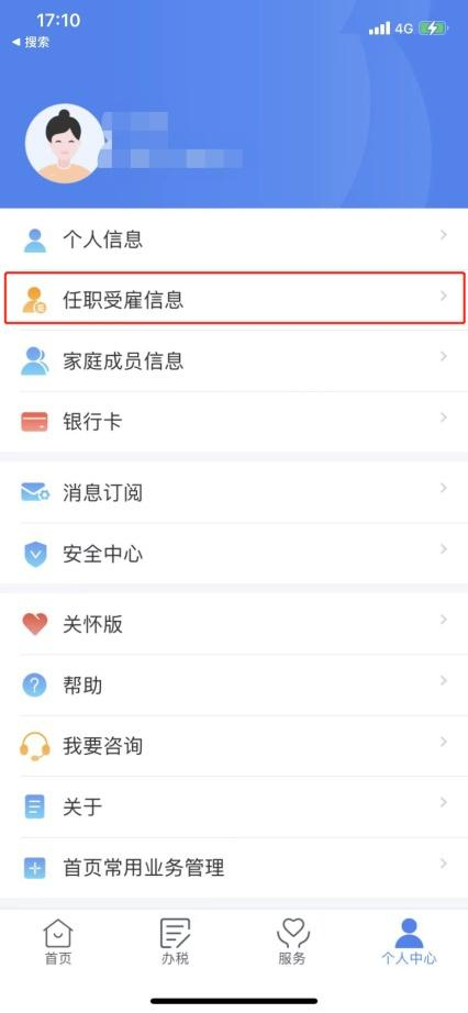 登录“个人所得税”APP,在【个人中心】中点开【任职受雇信息】,选择需要申诉的任职受雇单位。