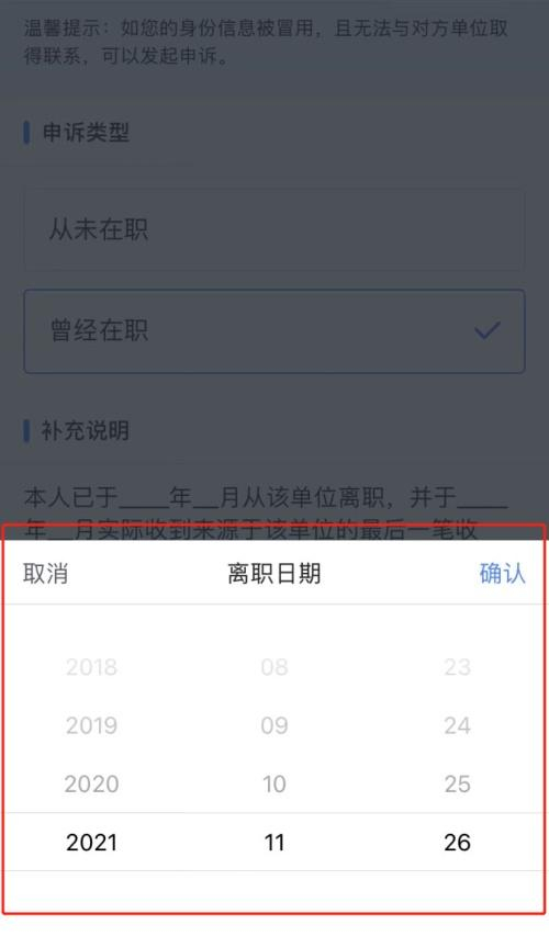 在【申诉类型】中选择【曾经在职】,在系统跳出的【离职日期】页面中确认离职日期,填写【补充说明】后点击【提交】。