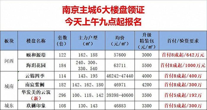 12月20日,南京主城6大热盘突领销许,今起报名。包括河西的海玥花园、颐和源璟,南部新城前几天刚刚首开的云锦四季、南宸紫阙,城东的玖樾印象,城南的纯新盘华发美的云筑,领证的6家楼盘均位于之前比较热门的板块。