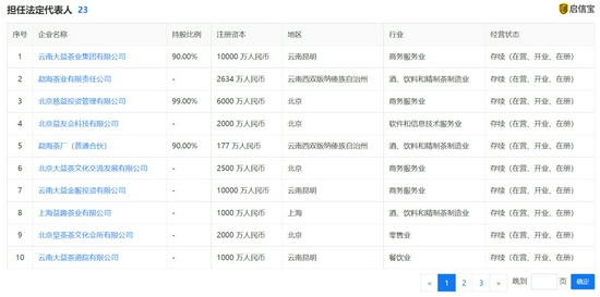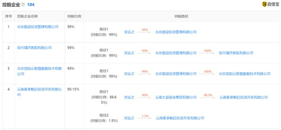 启信宝显示,吴远之目前为云南大益茶业集团有限公司的最大股东,持股比例为90%。此外,吴远之还担任云南大益微生物技术有限公司、西双版纳大益茶茶禅世界开发建设有限公司等23家公司的法人代表,而这些大多为大益集团的子公司或关联公司。