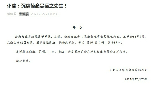 据大益茶官方微信号12月21日凌晨消息,云南大益茶业集团董事长、总裁,云南大益爱心基金会理事长吴远之先生,生于1966年7月,在加拿大旅居期间,因突发脑溢血,经抢救无效,于12月19日去世,享年55岁。