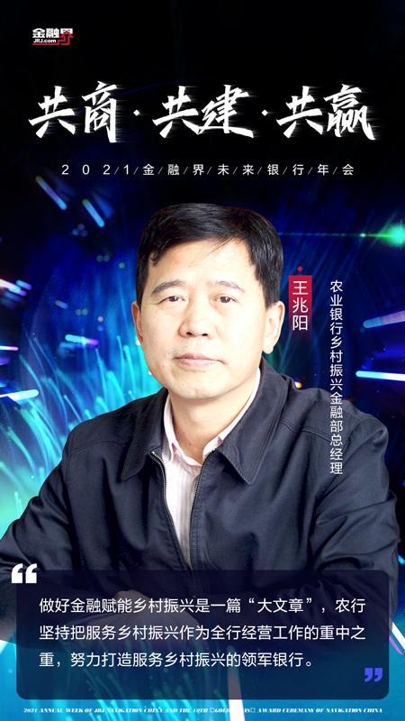 金融界12月21日消息 第十届领航中国年度盛典暨2021金融界未来银行年会今日盛大召开,主题是“共商 共建 共赢”,论坛聚焦银行高质量发展、金融科技创新赋能、财富管理业务转型等热点话题,邀请多家金融业界专家解密未来发展之路。农业银行乡村振兴金融部总经理王兆阳出席了2021金融界未来银行年会,并发表演讲。