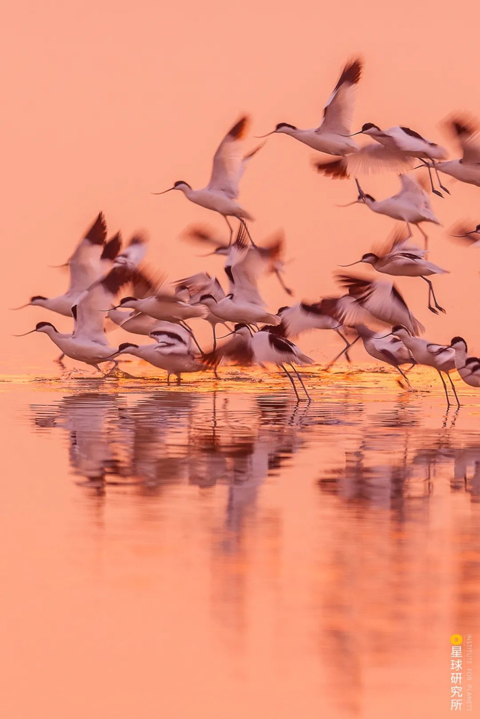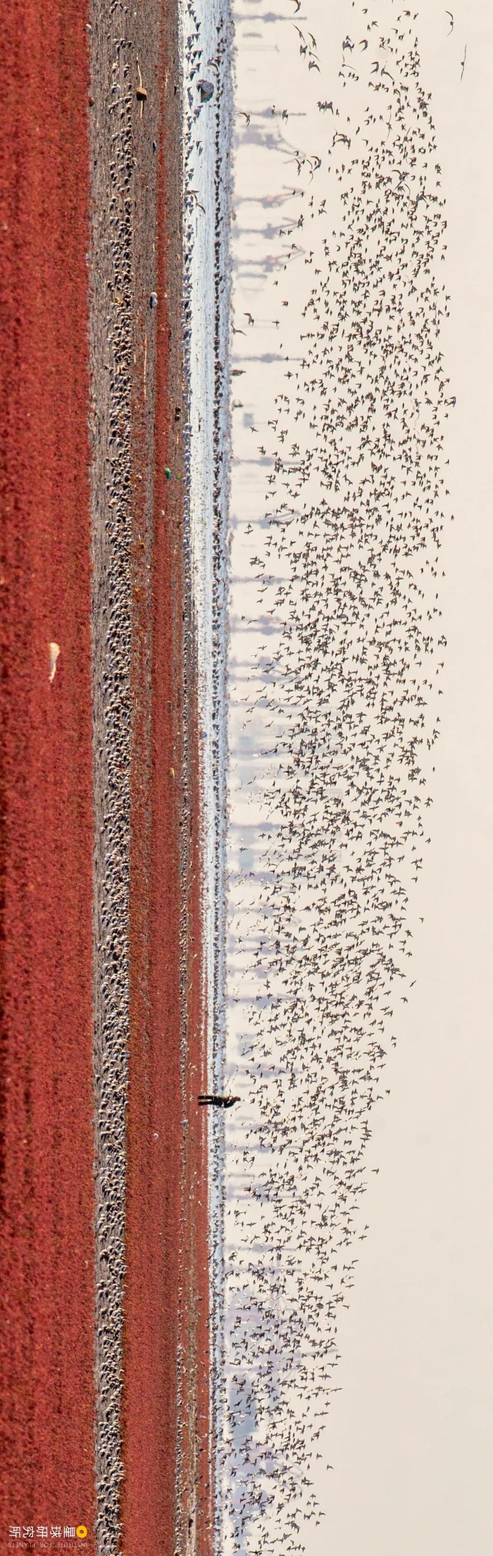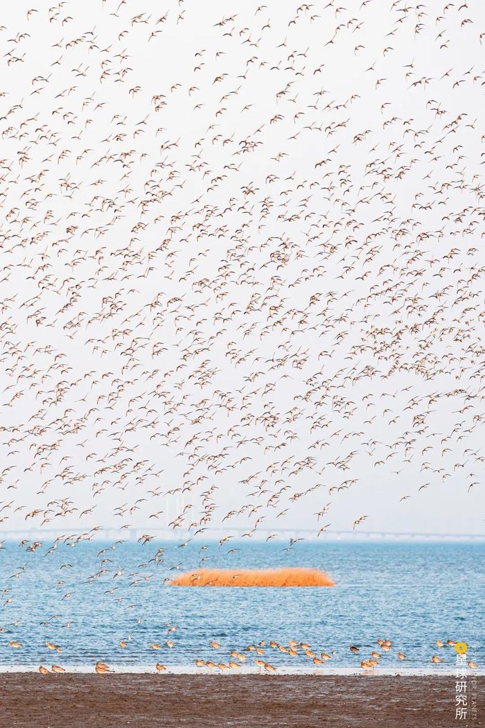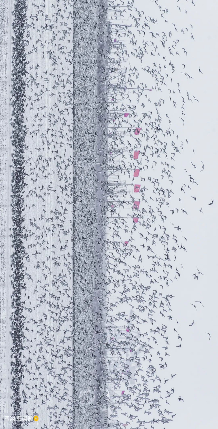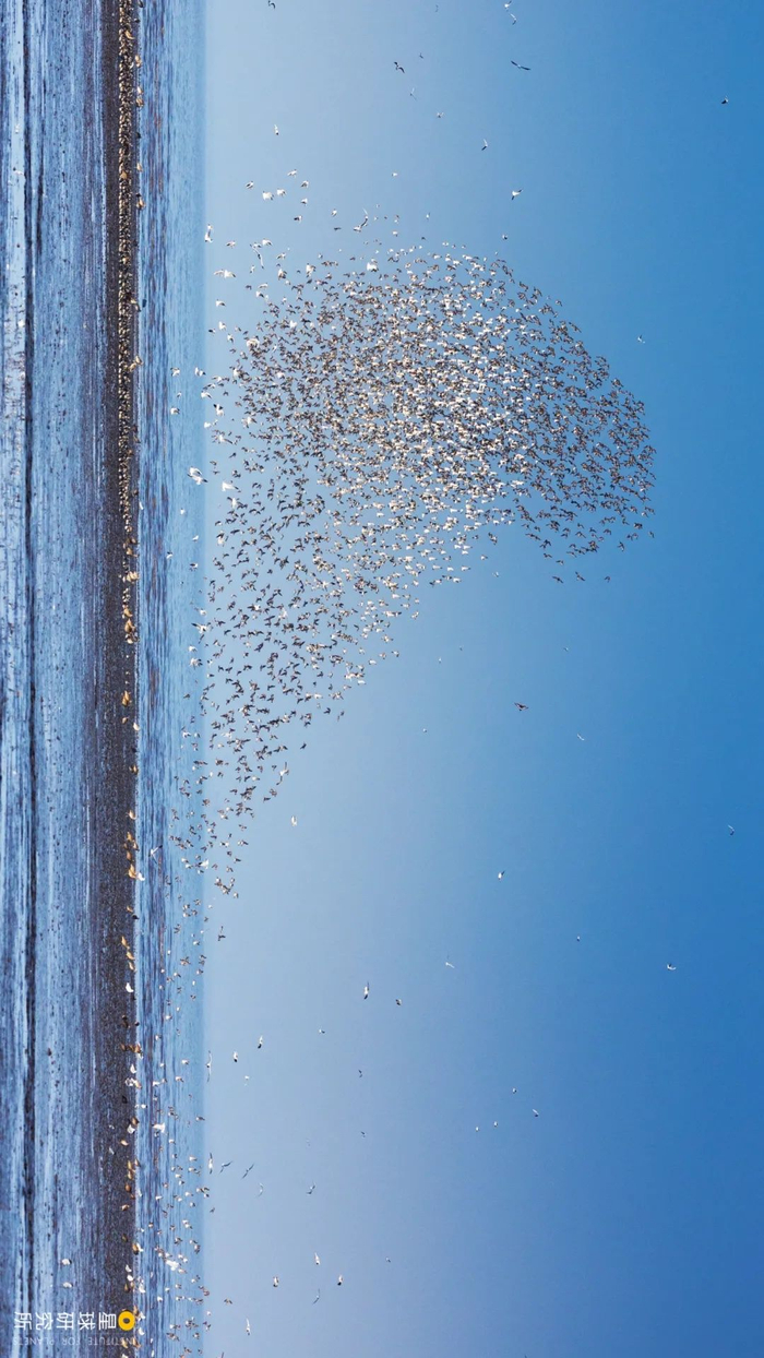 (请横屏观看;辽宁营口海滨的鸟浪奇观,摄影师@颜景龙)