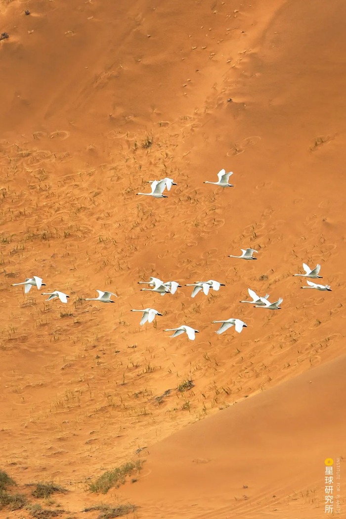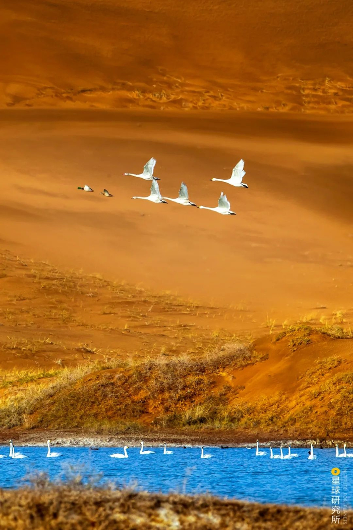 (两只绿头鸭Anas platyrhynchos和一群大天鹅飞过腾格里沙漠,摄影师@由美燕)