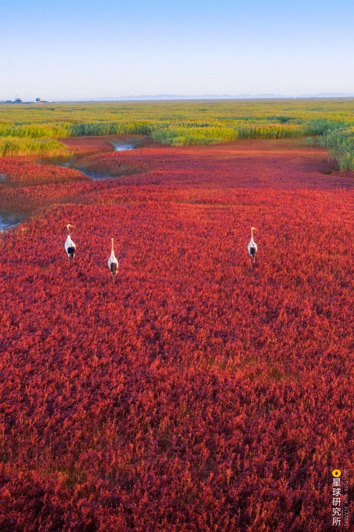 (3只丹顶鹤走在辽宁盘锦的红海滩上,这里大片的碱蓬草Suaeda glauca每年秋季会变成红色,远看十分漂亮,摄影师@王禹)