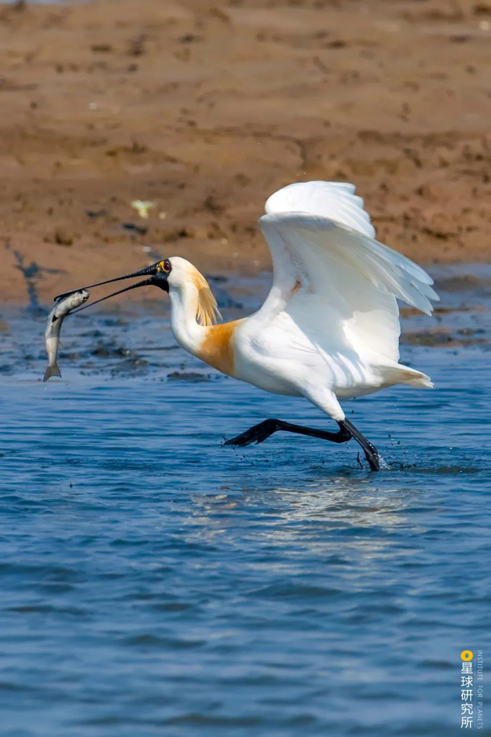 (一只黑脸琵鹭在江苏盐城的黄海湿地中抓到一条大鱼,摄影师@孙华金)