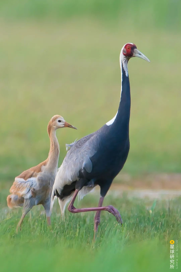 (白枕鹤Antigone vipio每年的5-7月份会在西伯利亚东南部、蒙古东北部和中国东北部繁殖育雏,从10月开始南迁至长江下游的湿地以及福建、台湾和日本南部越冬;图中的幼鸟有着一身不同于成鸟的黄色羽毛,摄影师@孙华金)
