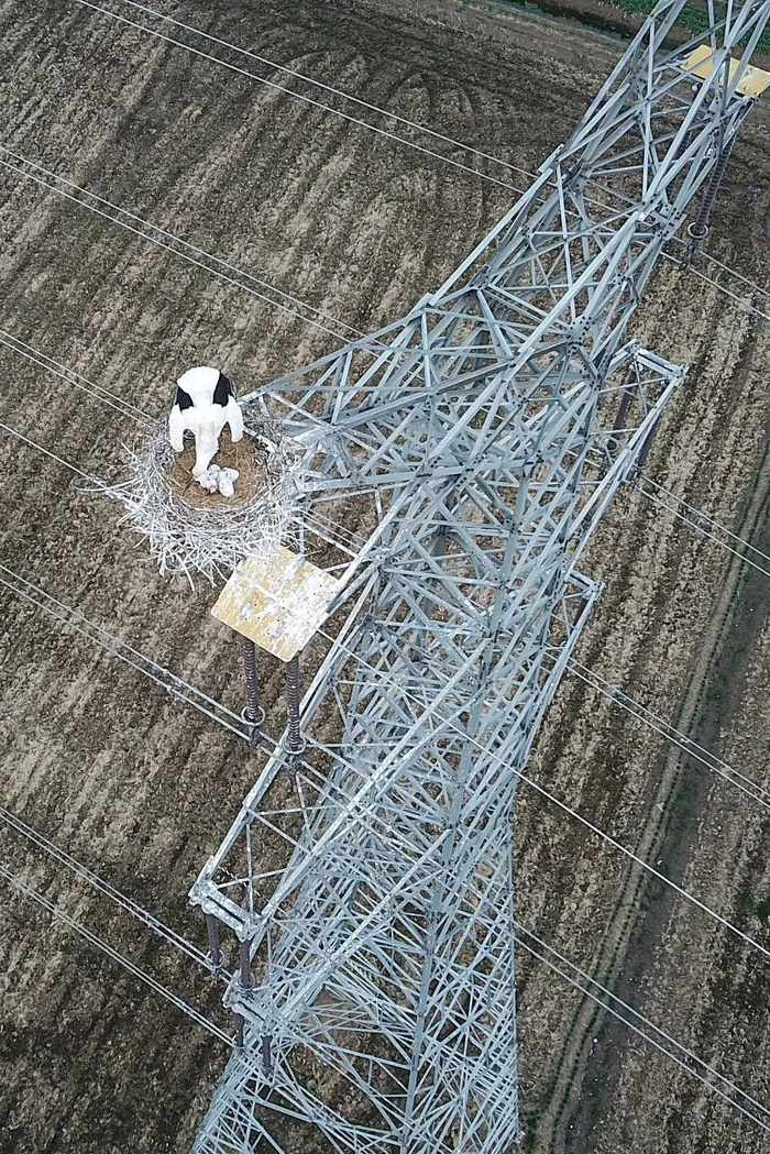 (江苏扬州的某处高压铁塔上,一个东方白鹳的巨大鸟巢安置其上,来源@视觉中国)